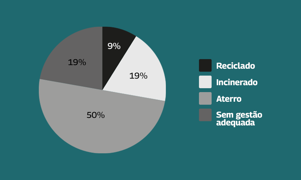 A OECD aponta que, do total global de resíduos plásticos, além dos 9% reciclados, cerca de 19% é incinerado, 50% vai para aterro e 22% fica sem gestão adequada (lixões, queima a céu aberto, vazamento no ambiente). Fonte: OECD (2022).